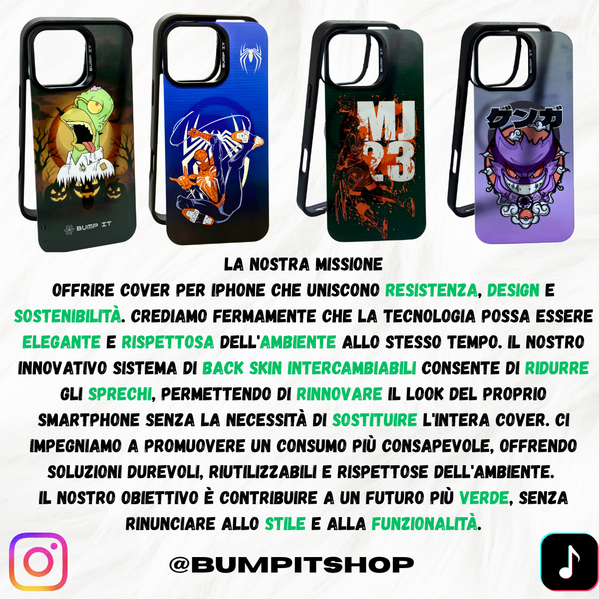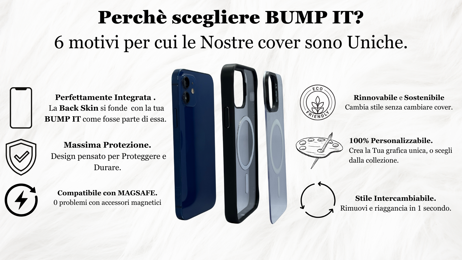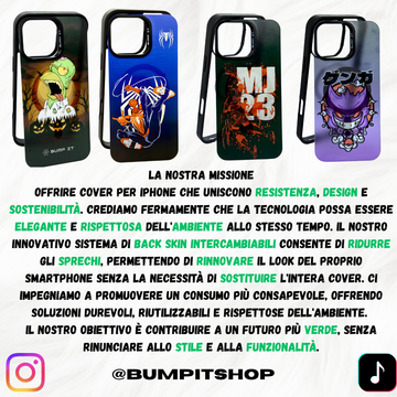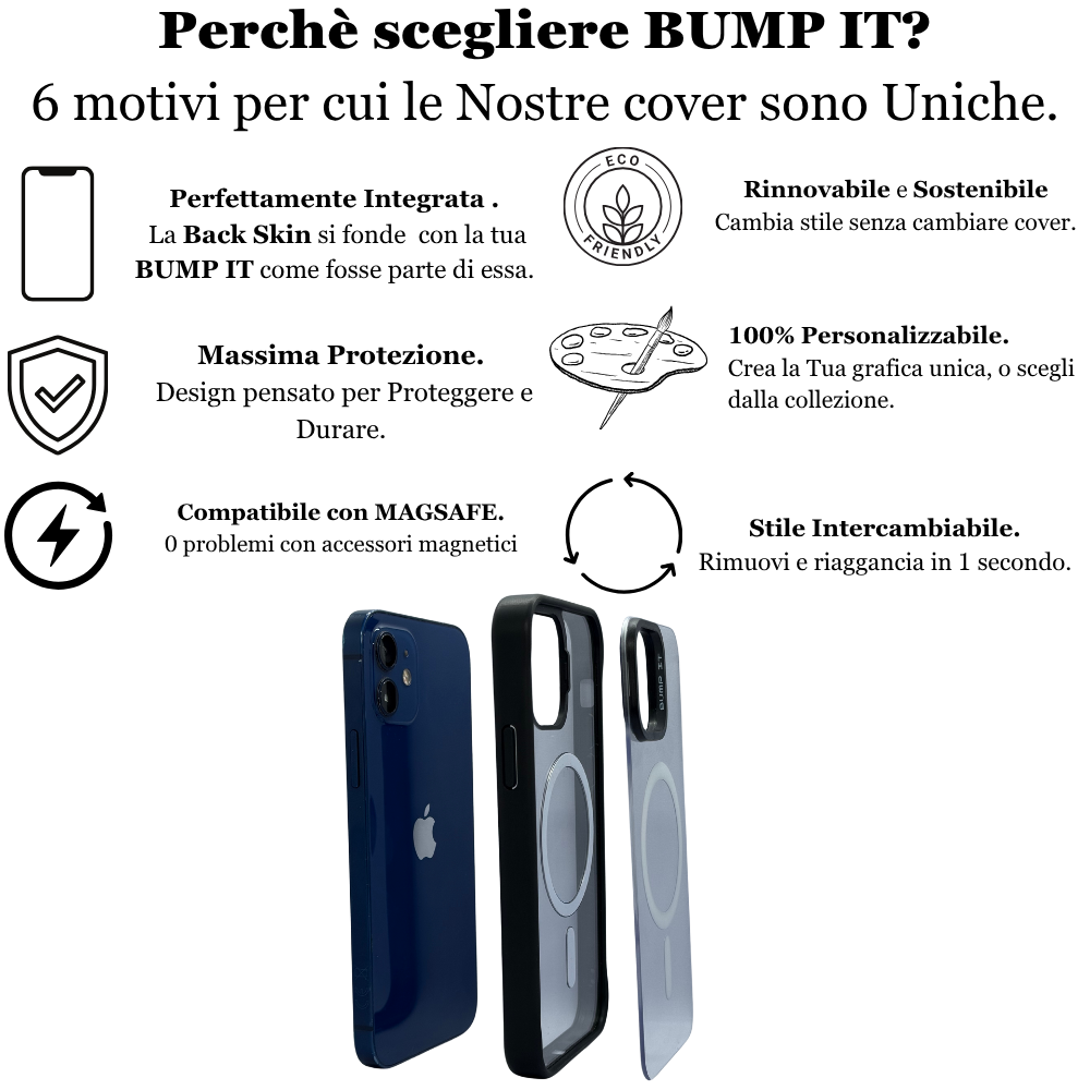 Realizzate con materiali resistenti, le cover BUMP IT sono progettate per durare nel tempo, unendo esclusività, rinnovabilità e sostenibilità