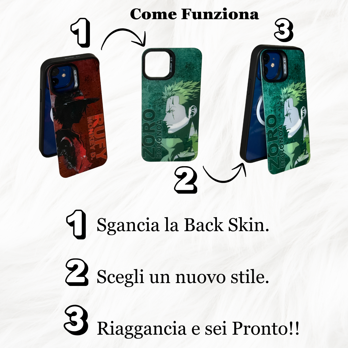 Grazie al sistema di Back Skin intercambiabili, puoi cambiare il design della Tua cover ogni volta che vuoi, mantenendo la stessa struttura di base. Questo non solo riduce gli sprechi, ma ti permette anche di esprimere la Tua creatività e il Tuo stile personale.